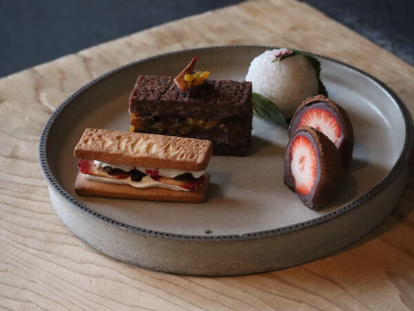 Valentine 特選菓子 左より ・あまおうサブレ(本日限定) ・和gâteau このわ山の柑橘とドライいちじく仕立て ・Valentine特製 さくら餅 塩漬け桜花 ・あまおうとカカオの...
